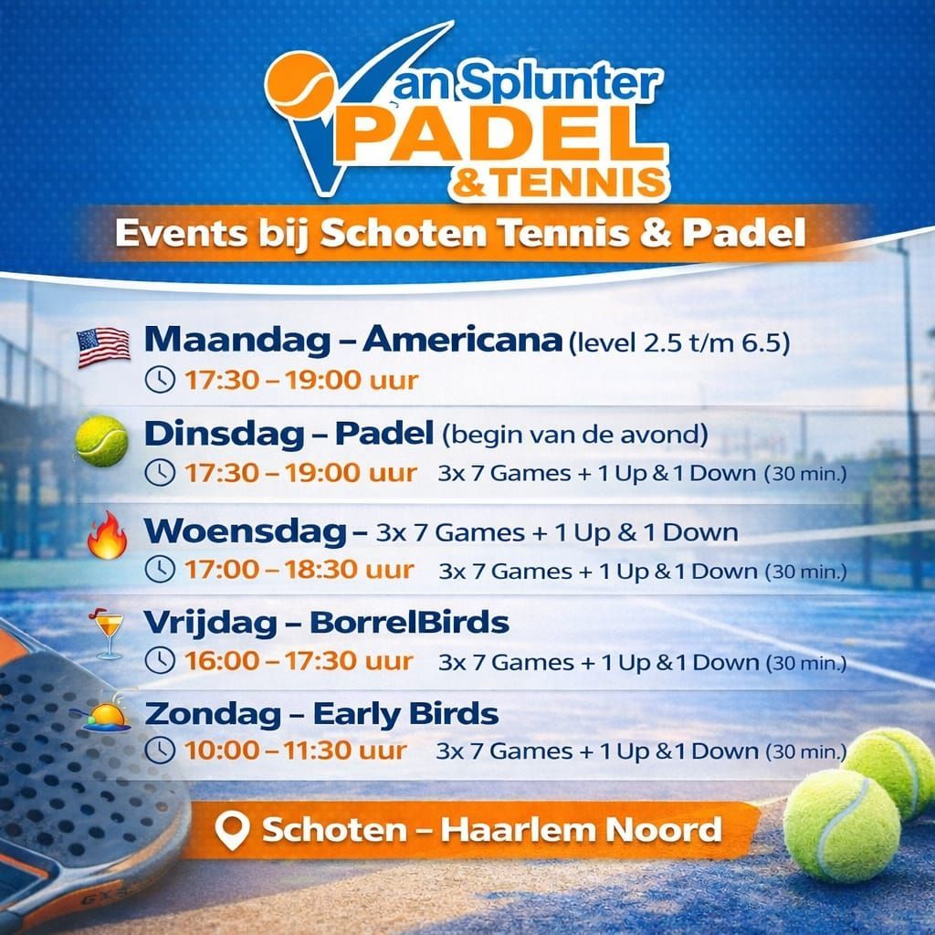 Van Splunter Tennis & Padel organiseert vaste speelmomenten voor een mix van spelers die spelen bij Schoten Tennis en Padel.